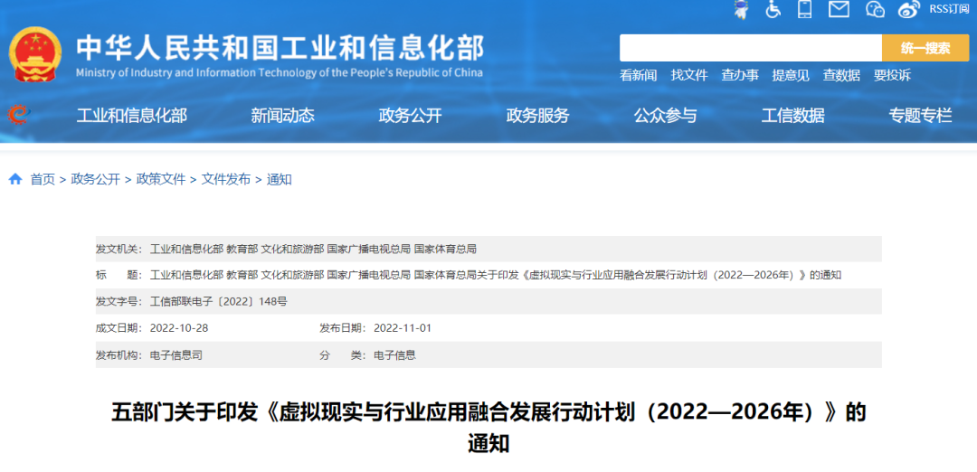 11月1日,工业和信息化部、教育部、文化和旅游部、国家广播电视总局、国家体育总局发布关于印发《虚拟现实与行业应用融合发展行动计划(2022—2026年)》(以下简称《行动计划》)的通知。