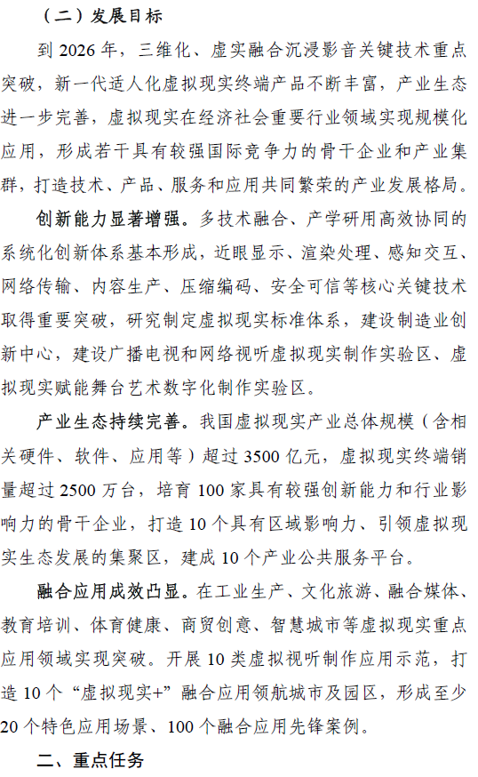 到2026年,三维化、虚实融合沉浸影音关键技术重点突破,新一代适人化虚拟现实终端产品不断丰富,产业生态进一步完善,虚拟现实在经济社会重要行业领域实现规模化应用,形成若干具有较强国际竞争力的骨干企业和产业集群,打造技术、产品、服务和应用共同繁荣的产业发展格局。