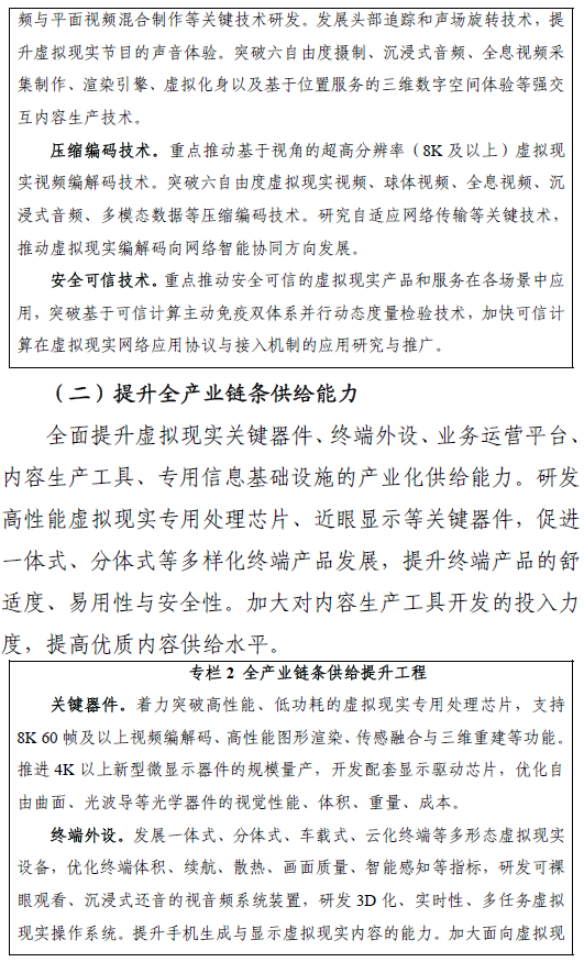 任务二:提升全产业链条供给能力。面向大众消费与行业领域的需求定位,全面提升虚拟现实关键器件、终端外设、业务运营平台、内容生产工具、专用信息基础设施的产业化供给能力。提升终端产品的舒适度、易用性与安全性。
