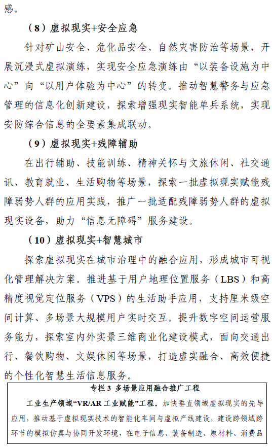 任务三:加速多行业多场景应用落地。面向规模化与特色化的融合应用发展目标,在工业生产、文化旅游、融合媒体、教育培训、体育健康、商贸创意、演艺娱乐、安全应急、残障辅助、智慧城市等领域,深化虚拟现实与行业有机融合。