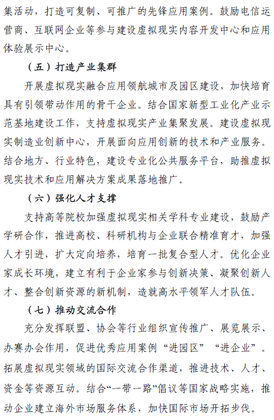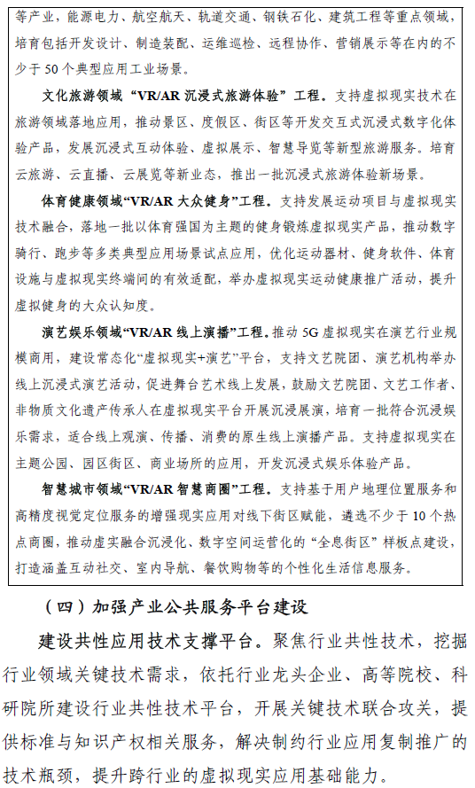 任务四:加强产业公共服务平台建设。面向行业共性需求,依托行业优势资源,重点建设共性应用技术支撑平台、沉浸式内容集成开发平台、融合应用孵化培育平台,持续优化虚拟现实产业发展支撑环境。