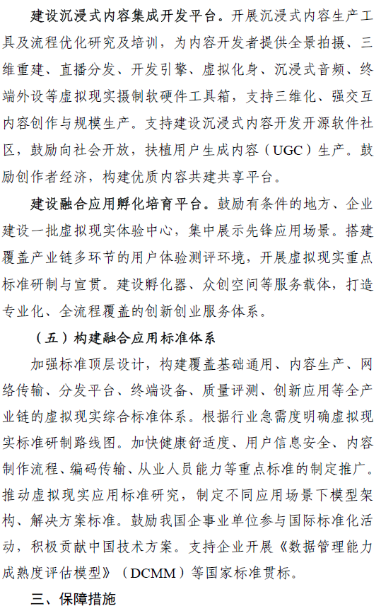 任务五:构建融合应用标准体系。加强标准顶层设计,构建覆盖全产业链的虚拟现实综合标准体系。加快健康舒适度、内容制作流程等重点标准的制定推广,推动虚拟现实应用标准研究。