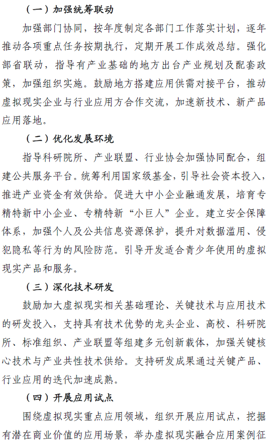 根据工业和信息化部官网发布的《虚拟现实与行业应用融合发展行动计划(2022—2026年)》解读,党中央、国务院高度重视虚拟现实产业发展。《中华人民共和国国民经济和社会发展第十四个五年规划和2035年远景目标纲要》将“虚拟现实和增强现实”列入数字经济重点产业,提出以数字化转型整体驱动生产方式、生活方式和治理方式变革,催生新产业新业态新模式,壮大经济发展新引擎。