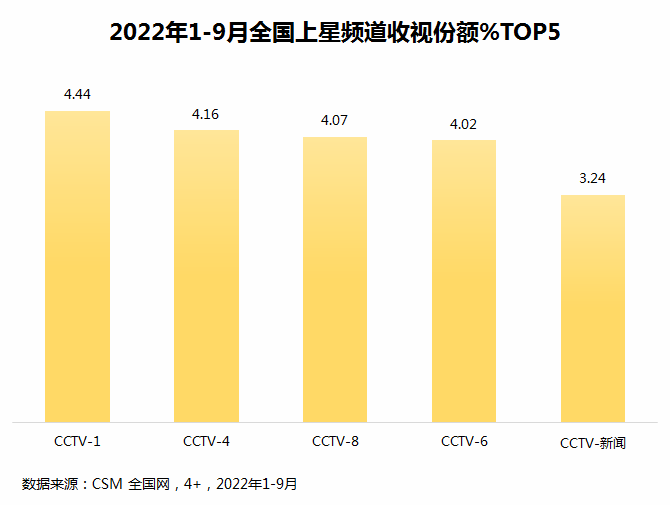 根据CSM数据,1-9月,总台电视端触达12亿人,包揽全国上星频道收视份额前五。CCTV-1稳居冠军,收视份额达4.44%;CCTV-4勇夺亚军,收视份额达4.16%;CCTV-8获得季军,收视份额达4.07%;CCTV-新闻位居第五,收视份额达3.24%。