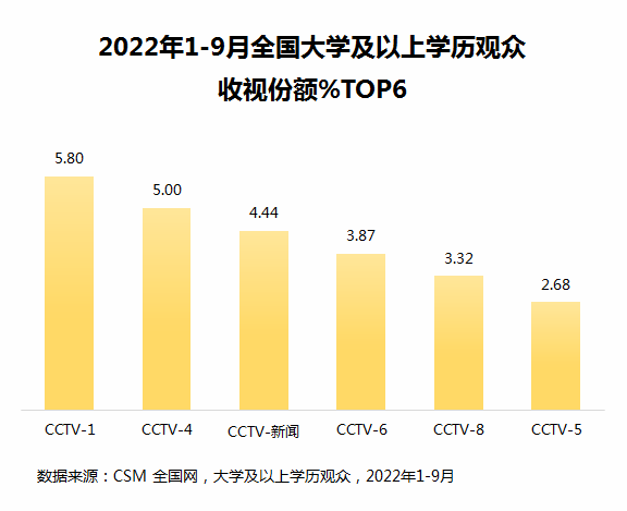 2022年1-9月,高学历观众汇聚总台。CCTV-1 大学及以上学历观众收视份额最高,达5.8%;CCTV-4紧跟其后,达5%;CCTV-新闻达4.44%;CCTV-8、CCTV-5分别为3.32%、2.68%。