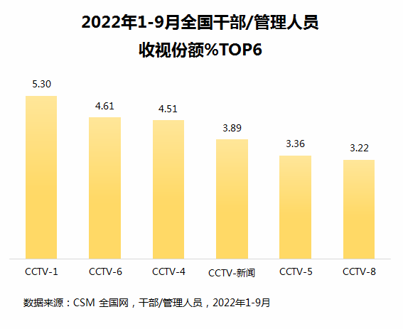 2022年1-9月,全国干部/管理人员收视份额最高的6个频道都在总台。CCTV-1 稳居第一,收视份额高达5.3%;CCTV-4达4.51%,CCTV-新闻达3.89%,CCTV-5、CCTV-8分别为3.36%、3.22%。