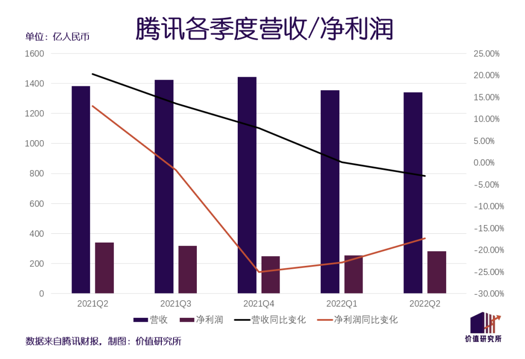 二季度财报显示,腾讯总营收为1340亿元,同比下滑3.1%,也不及市场预期的1356亿元;归母净利润则仅录得281亿元,高于市场预期的244亿,但同比大幅下滑17.3%。在此之前,腾讯营收增速已经连跌四个季度,如今直接进入负增长阶段,净利润则是连续三个季度出现同比下滑,“股王”的压力实在有点大。