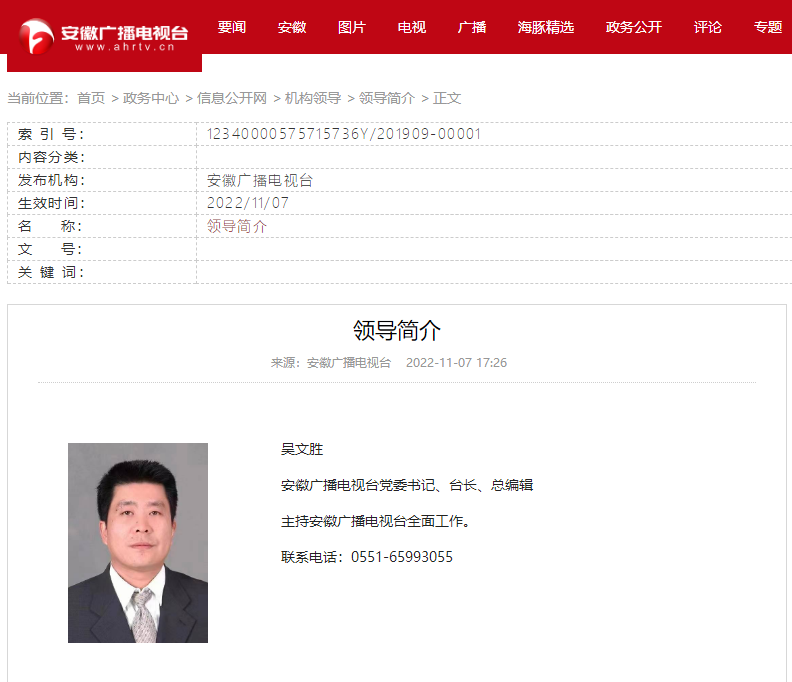 据安徽广播电视台官网信息,吴文胜任安徽广播电视台党委书记、台长、总编辑。