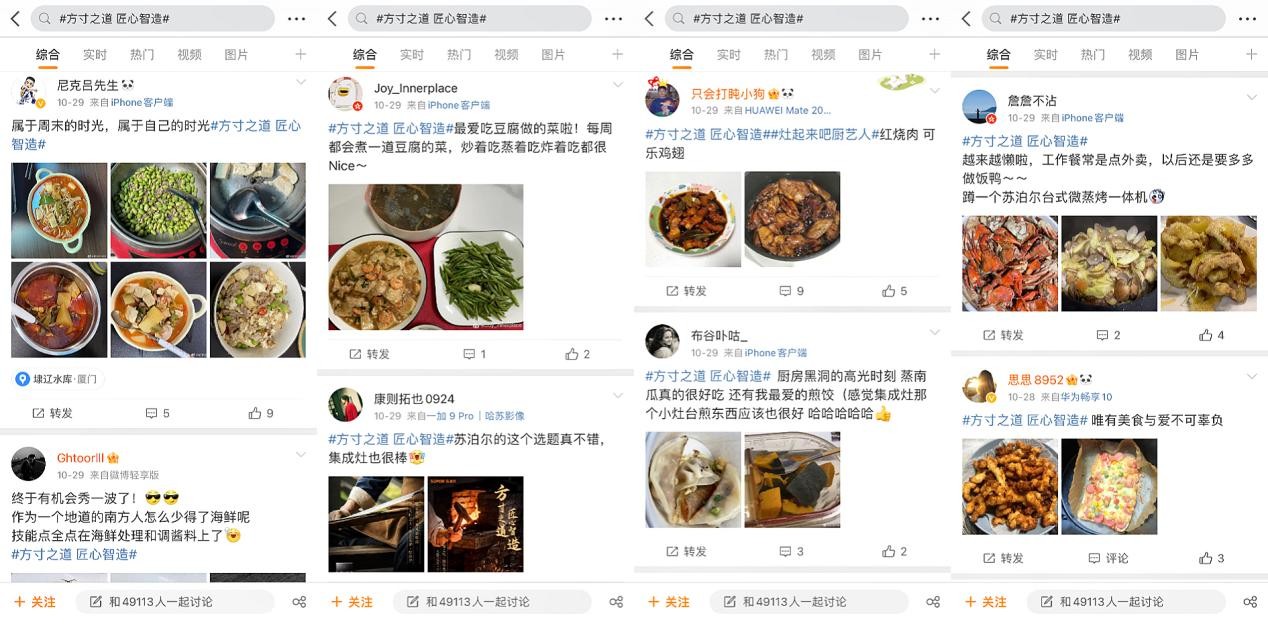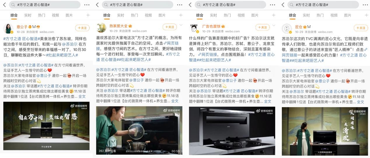 形成域内阵地KOL矩阵传播,发起#方寸之道匠心智造#商业话题以及#灶起来吧厨艺人#UGC互动话题,全面发声定调苏泊尔大家电匠心形象。