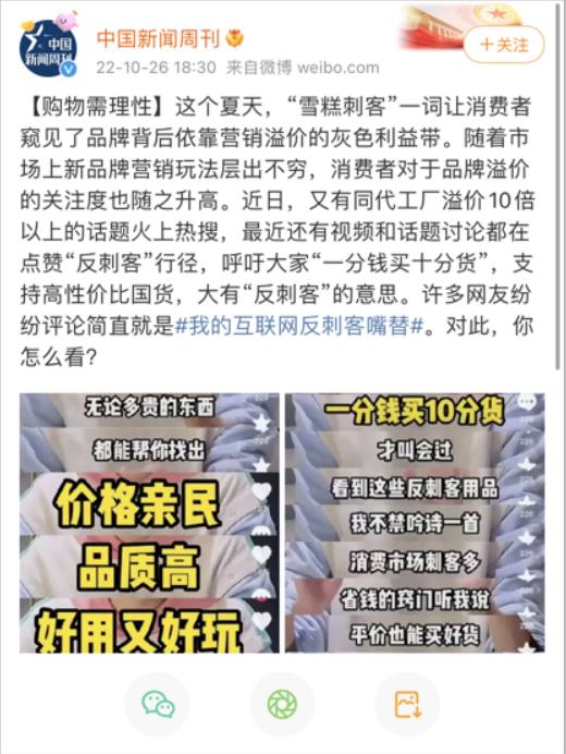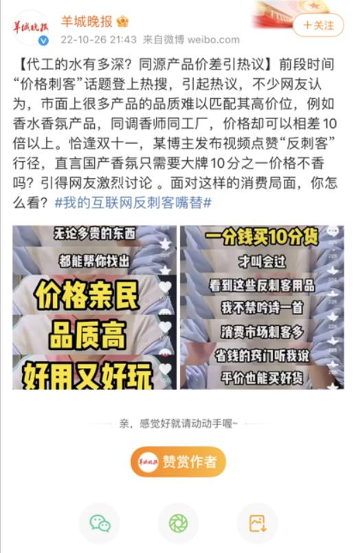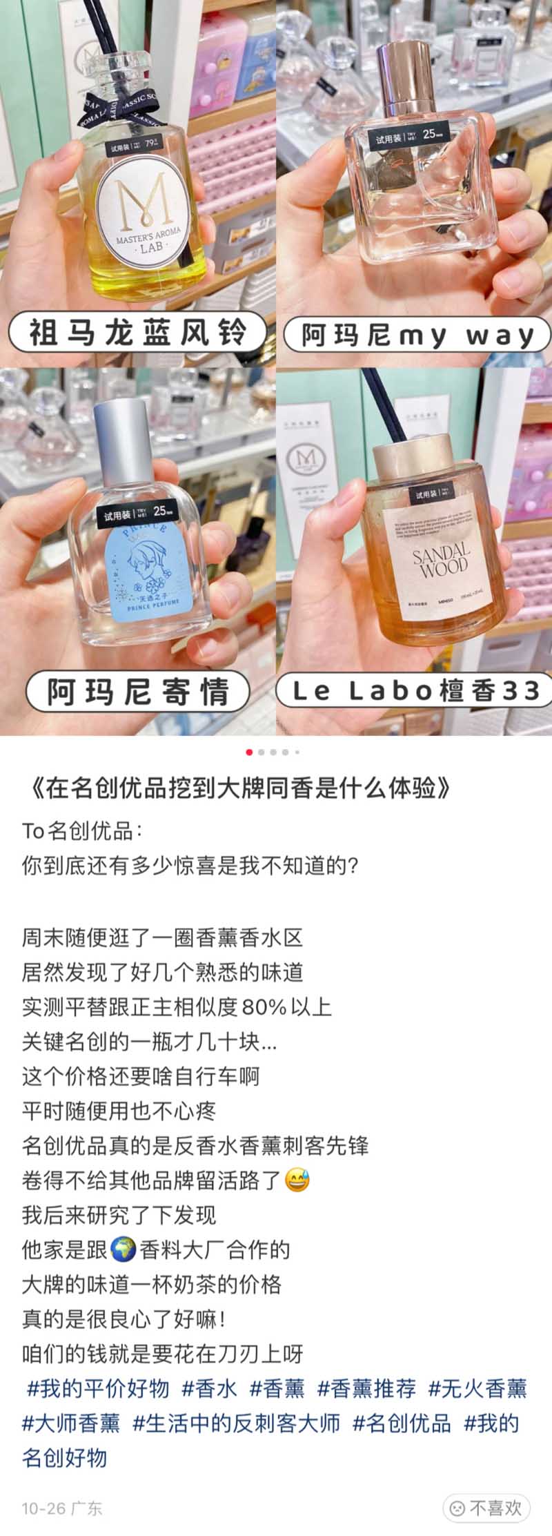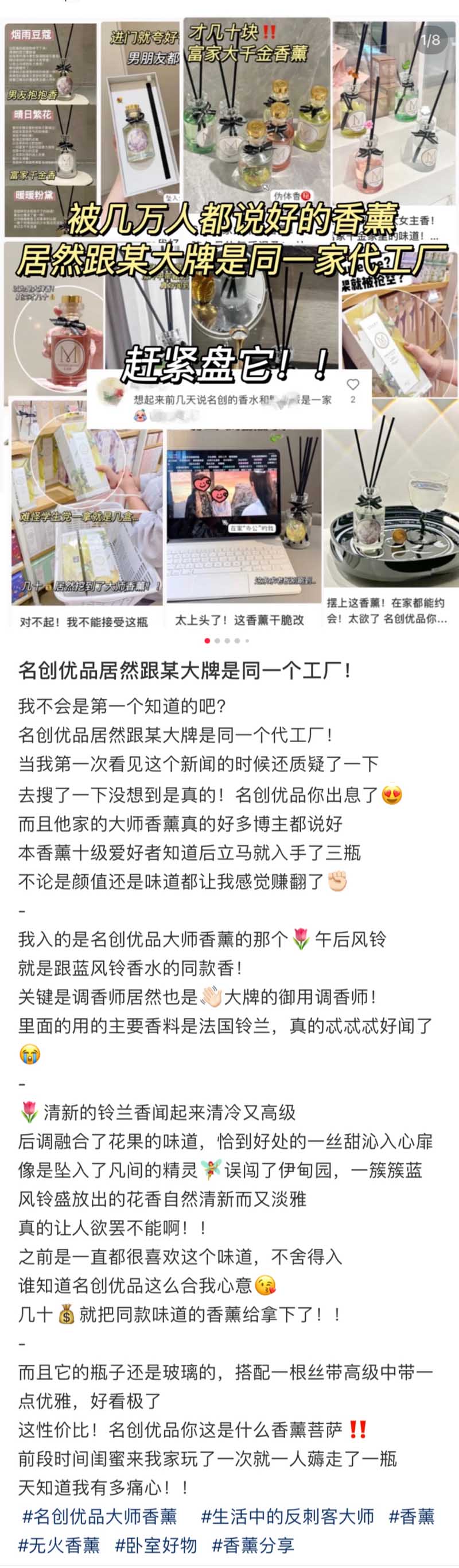 双十一前夕,“价格刺客”的话题登上了网络热搜榜,不少官方新闻媒体都在发声质疑品牌溢价、品质和价格不匹配的消费问题,博得网友们的纷纷响应。文章中还引用了早前一则关于品牌代工厂的新闻:出自同一代工厂、不同品牌的同款香水产品,售价竟相差了13倍。这不免令人质疑代工厂的“水”有多深,以及为品牌溢价埋单是否合理。一时间,“全民一起反刺客”成为了消费者的强烈呼声,网友们随之归纳出一系列高性价比的“反价格刺客”的国货品牌。这些品牌或产品在成分或功能上都与大牌同类产品可相媲美,价格却更亲民,更贴合“精明消费者”的需求,包括波司登羽绒服、花西子蜜粉、珀莱雅黑精华、薇诺娜药妆、小米电视、舒克电动牙刷等,而名创优品的大师香薰赫然排在首位。
