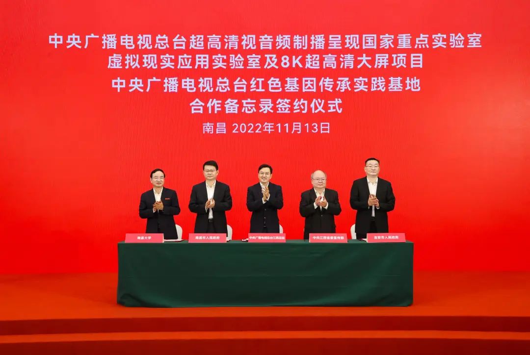 中央广播电视总台、南昌市政府、南昌大学签署总台超高清视音频制播呈现国家重点实验室虚拟现实应用实验室及8K超高清大屏项目合作备忘录。中央广播电视总台江西总站、江西省委宣传部、吉安市政府签署总台红色基因传承实践基地合作备忘录。