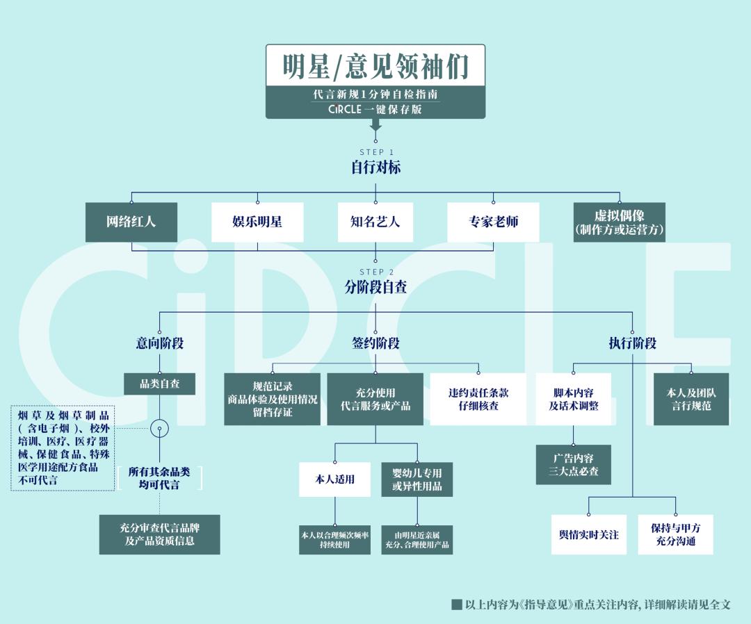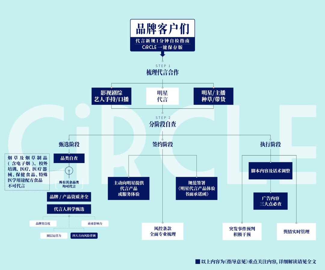 市场规范化的进程不会停止,《指导意见》进一步将合法代言的责任落实到明星个人。在此大趋势下,CiRCLE建议明星及团队需在合作的各个阶段做好相应功课: