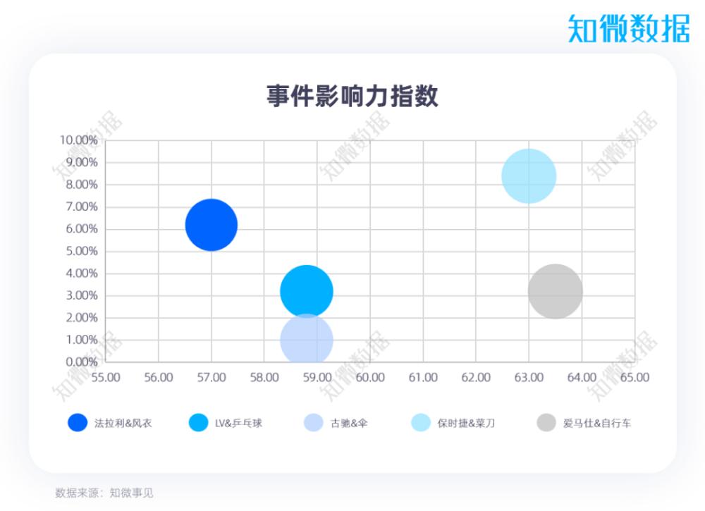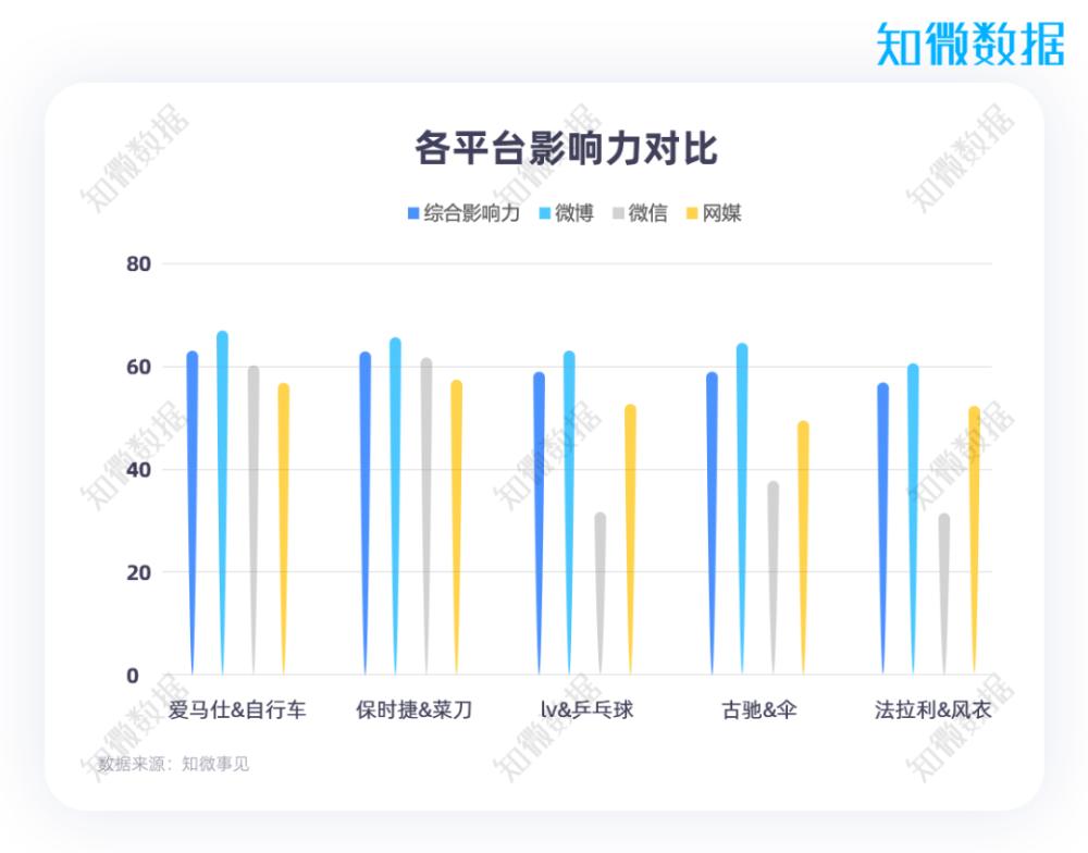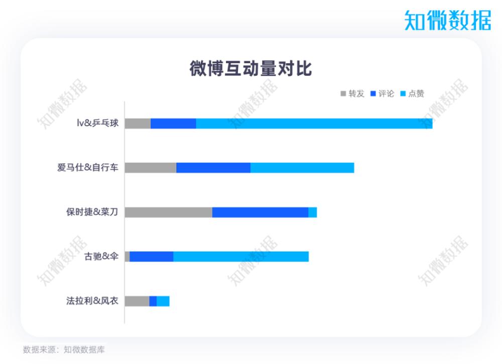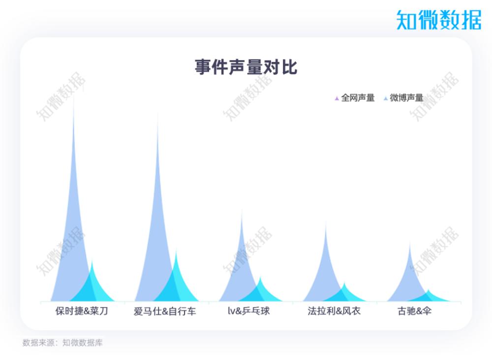 围绕几大品牌案例可以看到,“保时捷卖菜刀”“爱马仕卖自行车”事件传播声量相对较高;“lv售卖乒乓球““法拉利售卖风衣”声量在居中;“古驰卖伞事件”声量相对偏低。而互动量方面,多个品牌联动均产生对应讨论,转发量、评论量高于其他事件,网友讨论度较高。另外,事件讨论集中于微博,微博声量占主体。