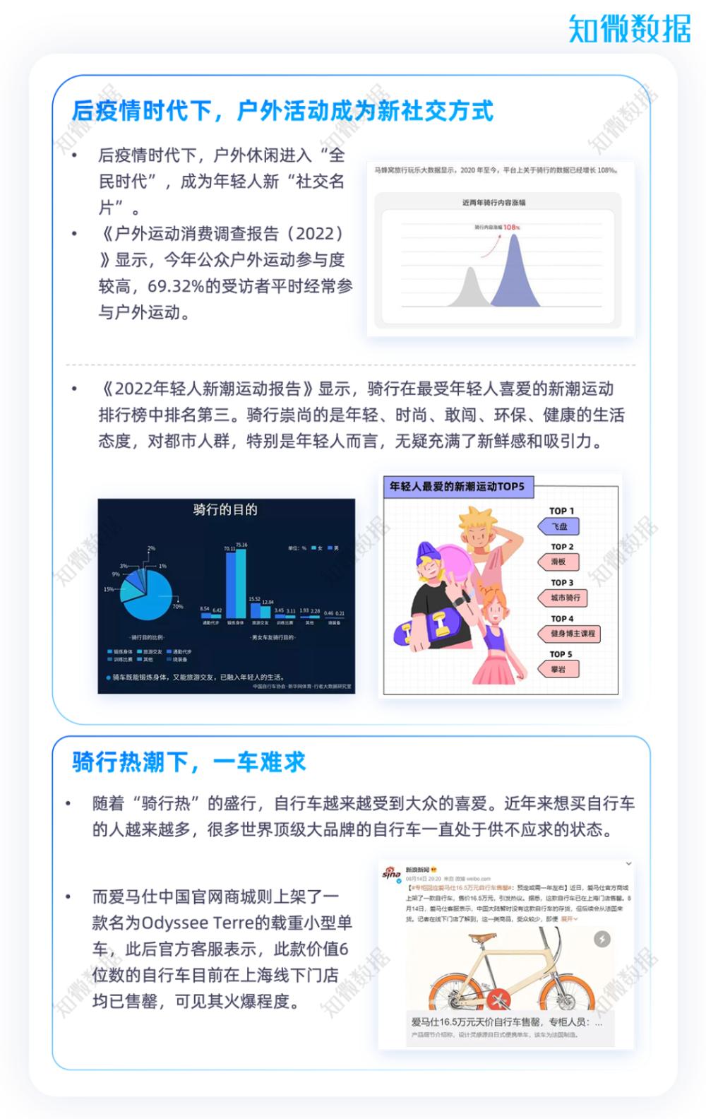 以骑行为例,骑行崇尚年轻、时尚、敢闯、环保、健康的生活态度,对都市人群,特别是年轻人而言,无疑充满了新鲜感和吸引力。8月11日,爱马仕中国官网商城上架了一款名为Odyssee Terre的载重小型单车,上架当天,此款价值6位数的自行车就已在上海线下门店售罄,可见其火爆程度。