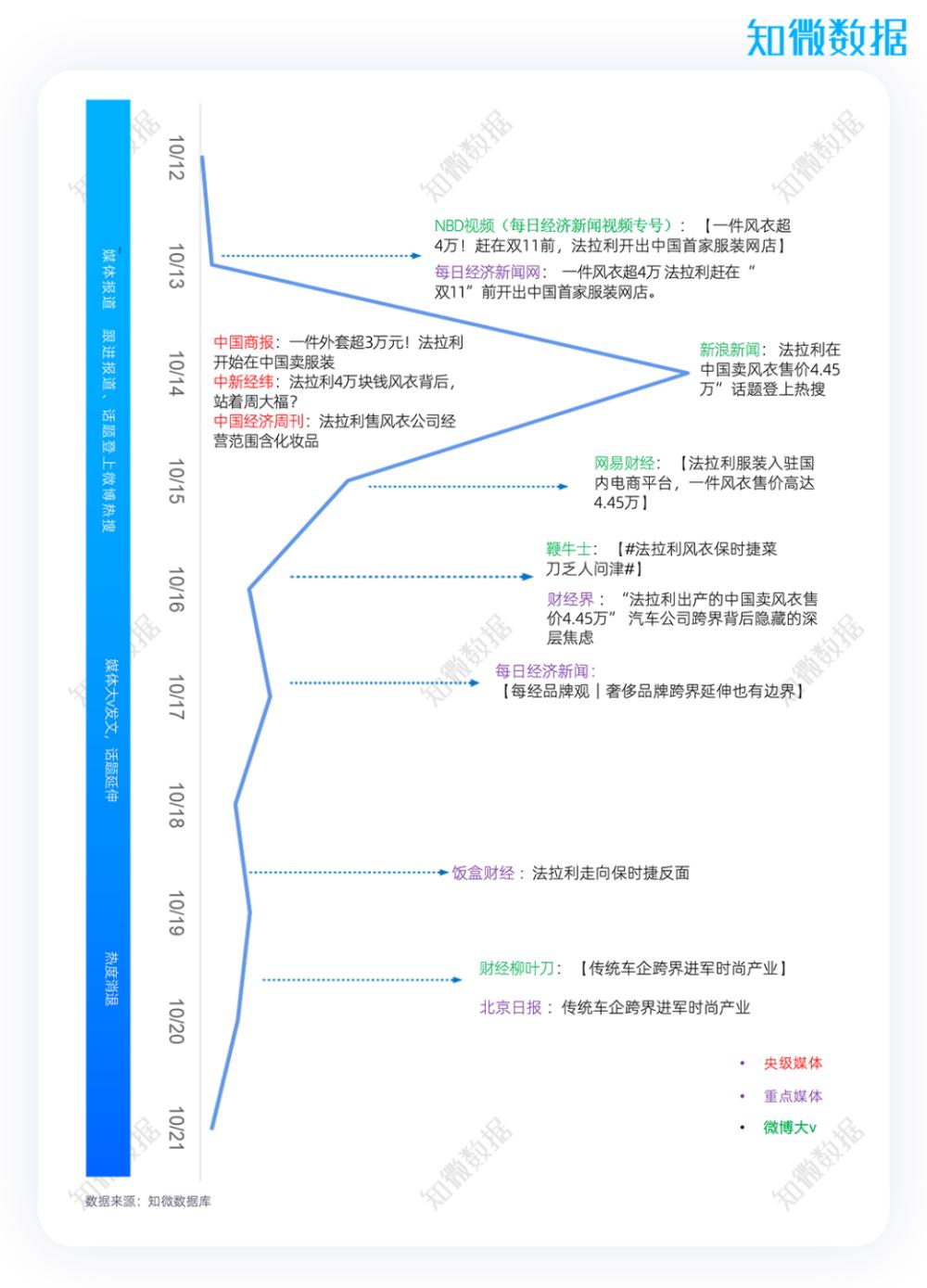 14日,话题“法拉利在中国卖风衣售价4.45万”登上微博热搜,引发央级媒体等媒体和公众的广泛关注,传播达峰值。随后,事件讨论延伸至汽车跨界与奢侈品跨界等话题,热度也逐渐消退。