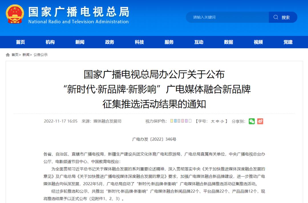 “新时代·新品牌·新影响”广电媒体融合新品牌征集推选活动结果的通知广电办发〔2022〕346号