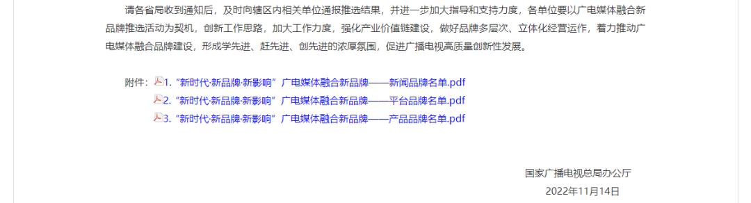 请各省局收到通知后,及时向辖区内相关单位通报推选结果,并进一步加大指导和支持力度,各单位要以广电媒体融合新品牌推选活动为契机,创新工作思路,加大工作力度,强化产业价值链建设,做好品牌多层次、立体化经营运作,着力推动广电媒体融合品牌建设,形成学先进、赶先进、创先进的浓厚氛围,促进广播电视高质量创新性发展。国家广播电视总局办公厅2022年11月14日