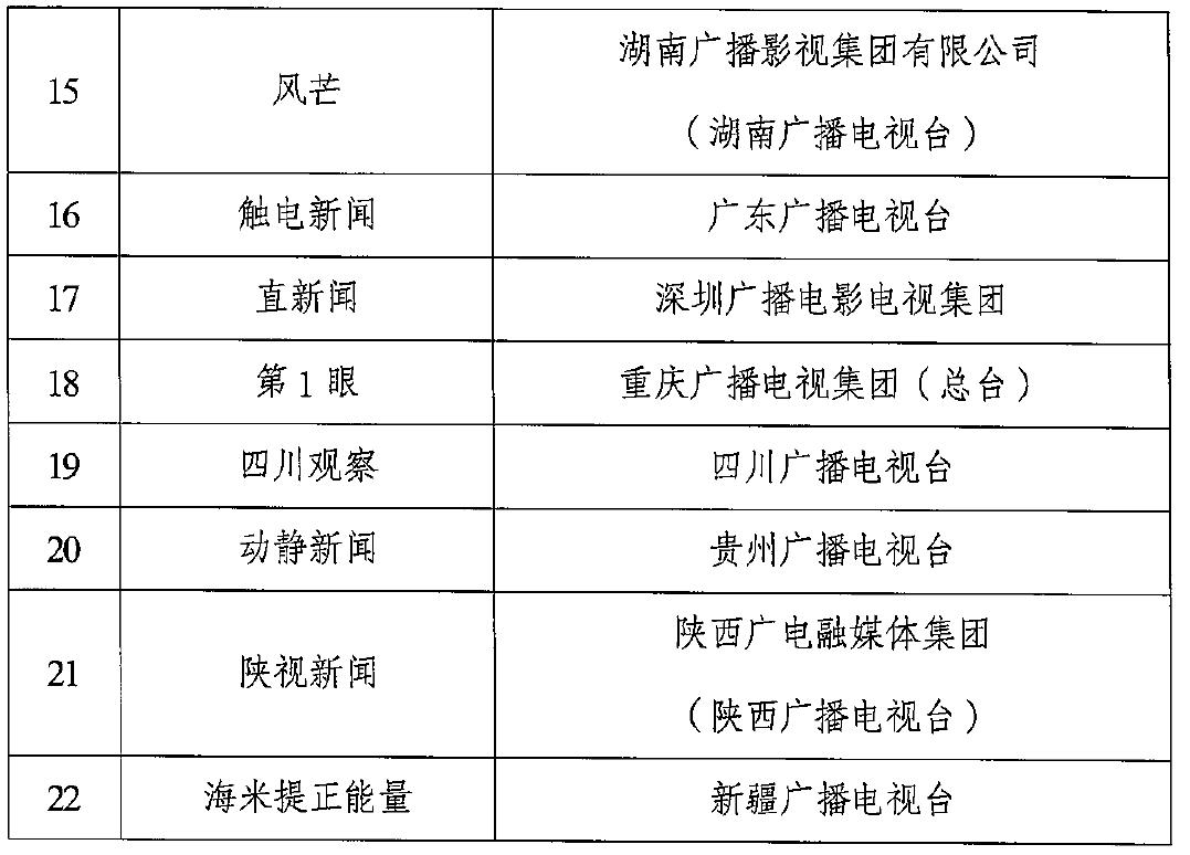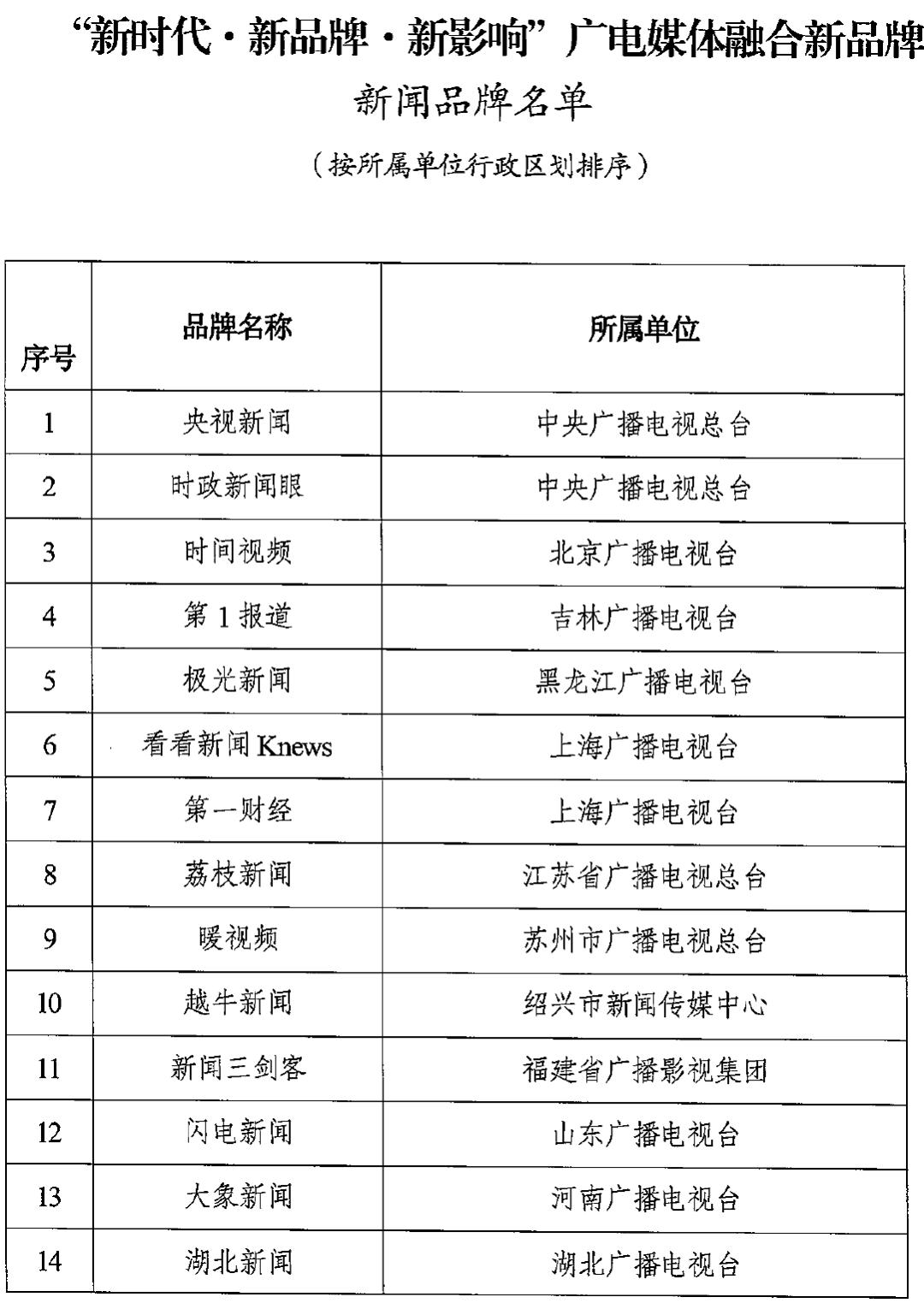 经过多轮推选和公示,“新时代·新品牌·新影响”广电媒体融合新闻品牌包含央视新闻、时政新闻眼、时间视频、第1报道、极光新闻、看看新闻Knews、第一财经、荔枝新闻、暖视频、越牛新闻、新闻三剑客、闪电新闻、大象新闻、湖北新闻、风芒、触电新闻、直新闻、第1眼、四川观察、动静新闻、陕视新闻、海米提正能量共22个。