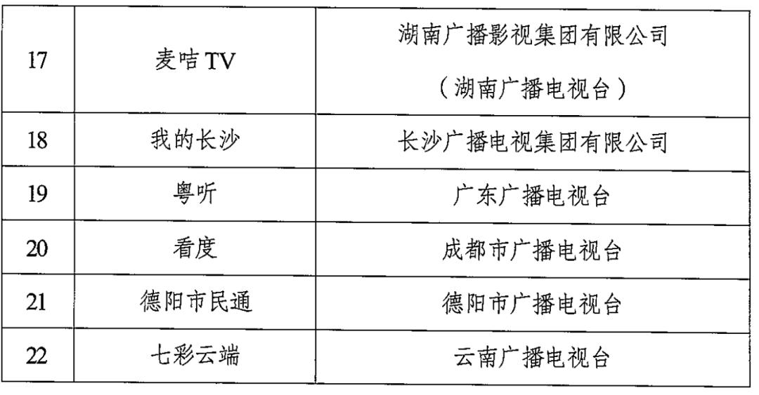 平台品牌包含央视频、云听、1905电影网、北京时间、听听FM、北斗融媒、百视TV、阿基米德FM、大蓝鲸、无锡博报、中国蓝TV、海博TV、看厦门、今视频、长江云、芒果TV、麦咭TV、我的长沙、粤听、看度、德阳市民通、七彩云端共22个。