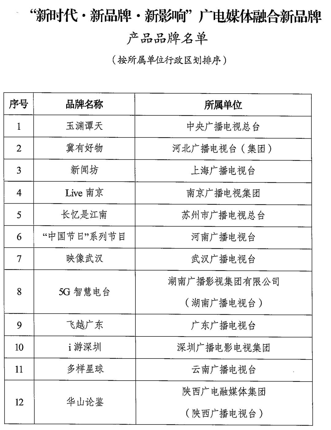 产品品牌包含玉渊潭天、冀有好物、新闻坊、Live南京、长忆是江南、“中国节日”系列节目、映像武汉、5G智慧电台、飞越广东、游深圳、多样星球、华山论鉴共12个。以下为通知全文:国家广播电视总局办公厅关于公布
