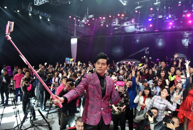 图为周杰伦受聘为某品牌首席惊喜官,用手机与现场的粉丝自拍。(图片由CNSPHOTO提供)