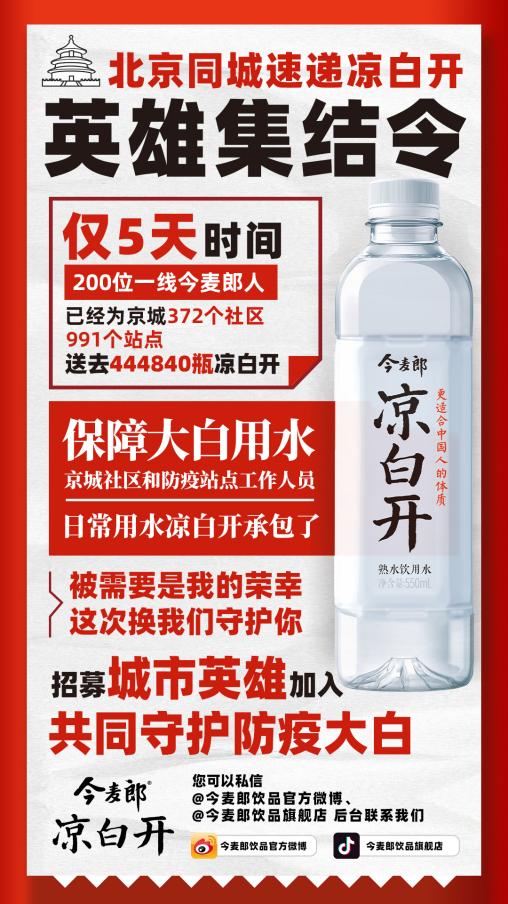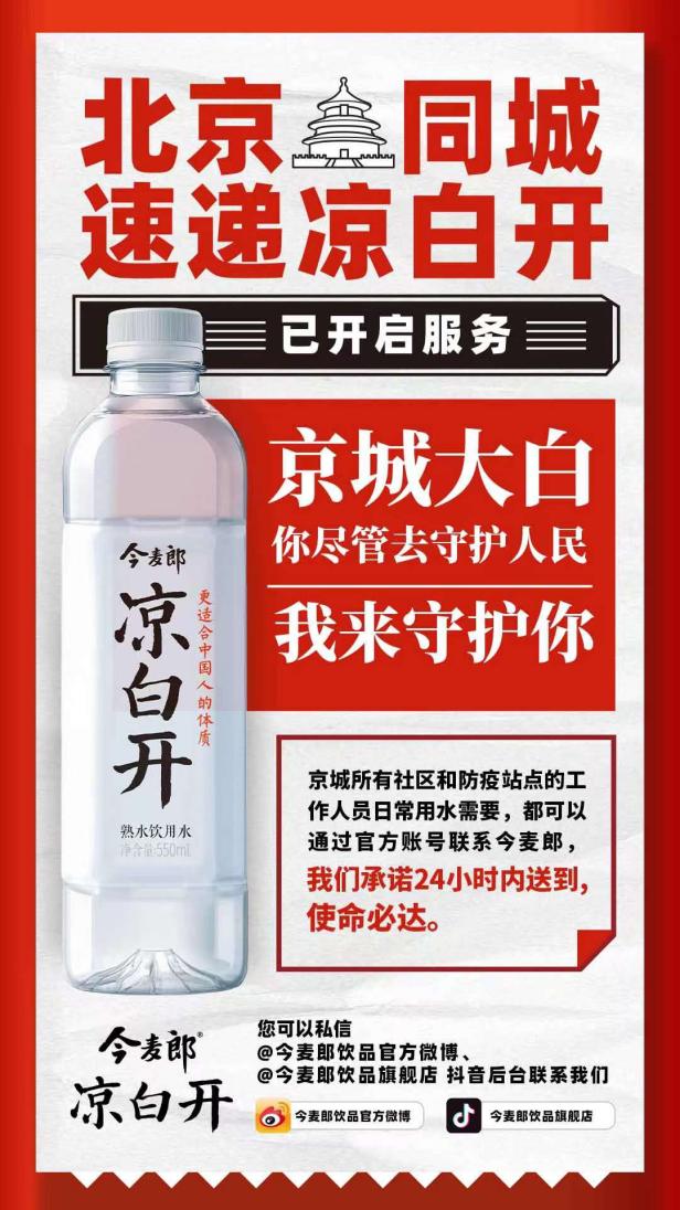 今年新冠疫情多点散发,为正常的生产和生活带来了不小的影响。全国多个地区陆续开展多轮常态化核酸检测,许多工作人员坚守在防疫一线。春末夏初,北京疫情形势严峻,防控一线工作人员压力陡增。为了满足一线工作人员的饮水需求,5月15日,今麦郎饮品在其官方微博发布“北京同城速递凉白开”行动信息,承诺北京所有社区和防疫站点工作人员日常用水需要,都可以通过官方账号联系今麦郎饮品,今麦郎饮品将派专人24小时免费送到。
