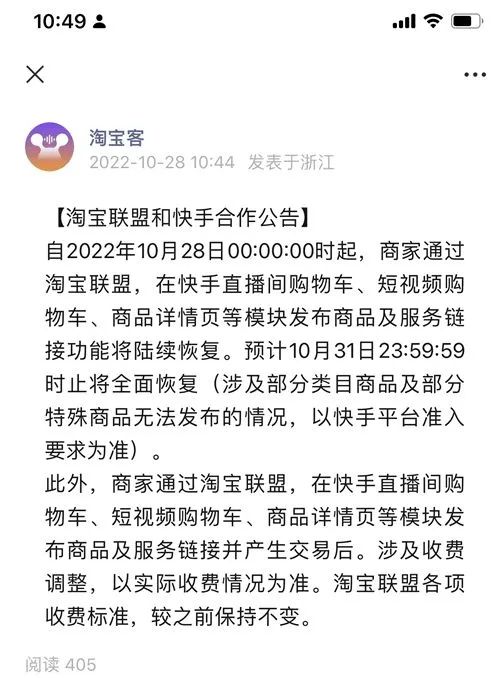 但谁也没想到就在短短的8个月之后,淘宝和快手就再一次“破镜重圆”,在不久之前,淘宝联盟、京东联盟的商品链接将重新在快手直播间、短视频的小黄车,以及商品详情页发布商品等服务都将新上线,根据目前的消息来看这些内容会在10月31号完成上线。