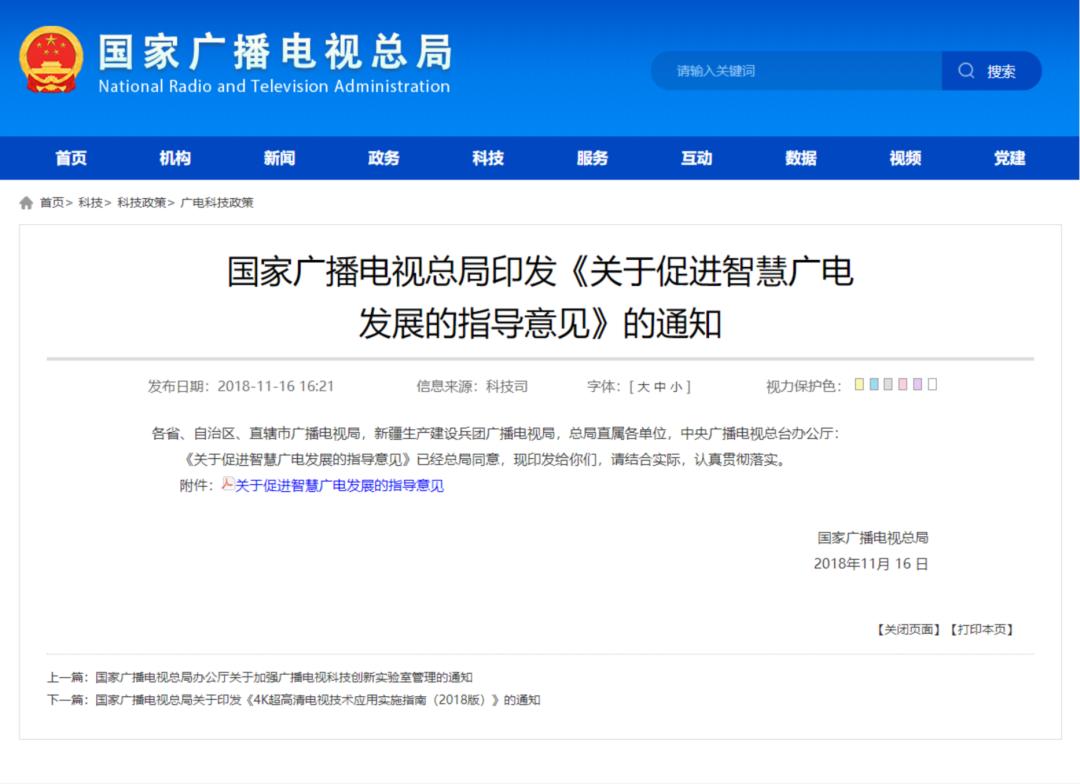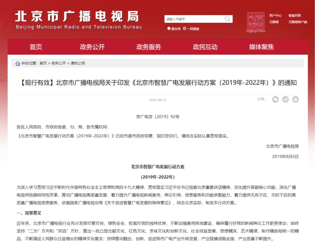 北京市落实国家广播电视总局《关于促进智慧广电发展的指导意见》,印发《北京市智慧广电发展行动方案》,以推进广播电视高质量发展为主线,以深化广播电视与新一代信息技术融合创新为重点,推动广播电视从数字化网络化向智慧化发展,推动新一轮重大技术革新与转型升级,从功能业务型向创新服务型转变。