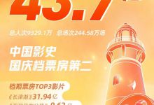 截止10月7日晚9点,国庆档7天(10.1-10.7)总票房共43.7亿元,总人次9329.1万,总场次244.58万场。档期票房前三影片分...